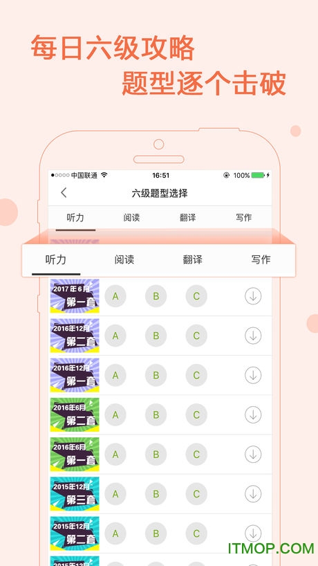 app内包含完整的六级考试知识体系:5500+核心词汇、100+高分作文模板、300+听力训练素材、200+阅读篇章、150+翻译练习,以及2011年6月至2017年6月共12套完整真题及详细解析。所有内容按考试大纲科学分类,支持智能组卷和个性化练习。
