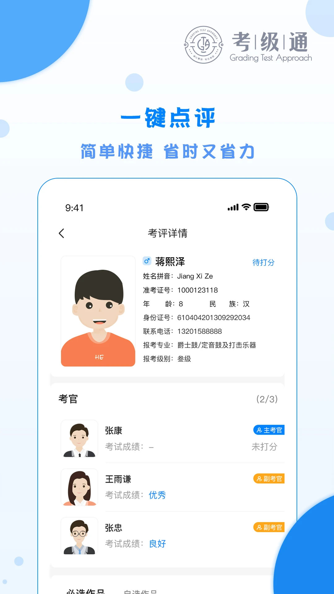 考级报名管理:支持在线报名、信息填写、资料上传,简化报名流程。考官评分系统:提供数字化评分工具,支持多维度评分标准,确保评分公正性。