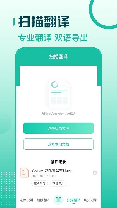 拍照识别:通过智能拍摄功能,可自动切边去除杂乱背景,生成高清扫描件,支持多种文件类型识别。OCR文字识别:采用先进的光学字符识别技术,能快速将图片中的文字转换为可编辑文本,支持PDF等多种输出格式。历史记录:完整保存所有扫描记录,采用智能分类存储方式,确保文件随时可查不丢失。扫描翻译:不仅能识别各类文本资料,还能进行多语言互译,支持编辑和分享处理后的内容。证件识别:专业证件扫描模式可自动校正变形,确保重要证件信息清晰可读,支持多种格式保存。