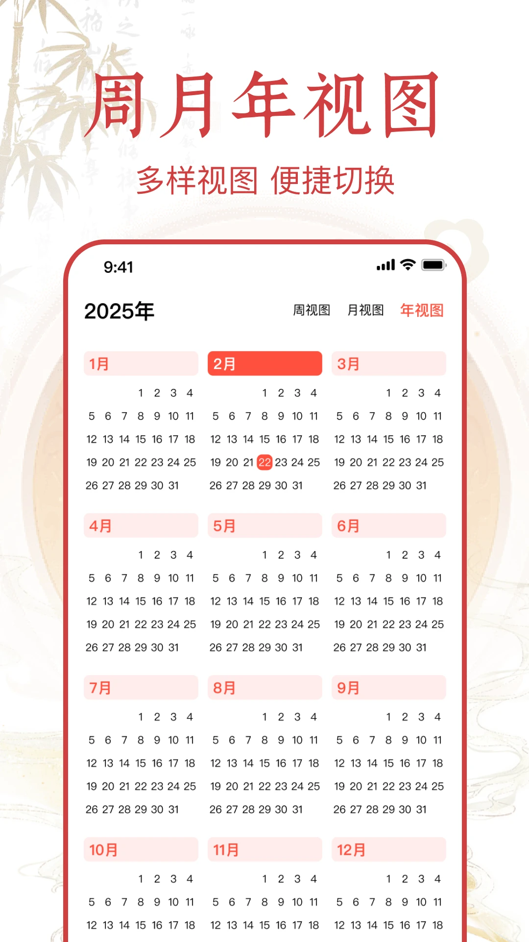 简洁日历视图:提供直观的月视图和周视图,用户可以快速切换查看不同时间段的安排。