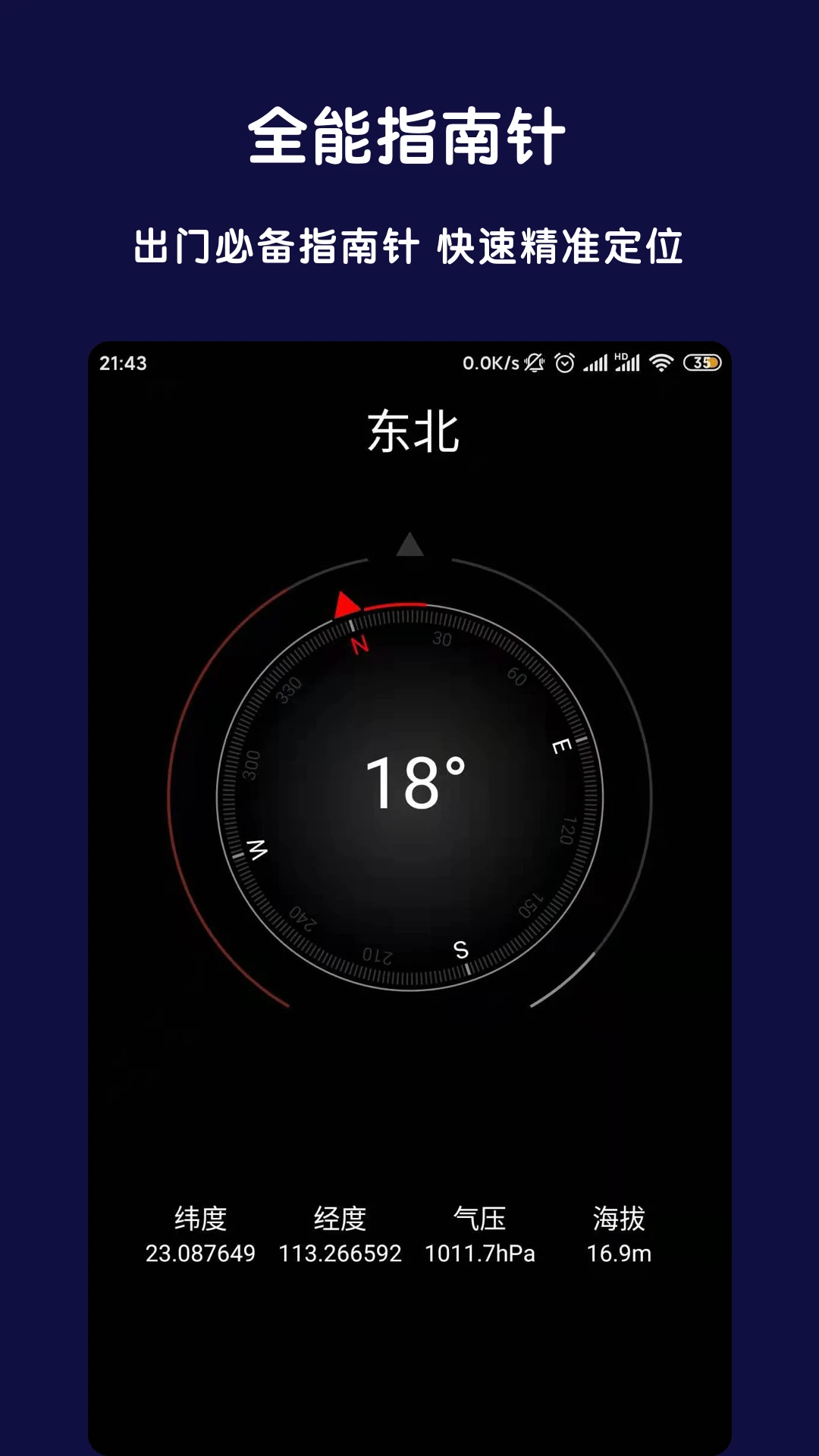 全能指南针是一款让你快速找到方向感的指南针,功能简洁直观的多功能指南针功能列表: