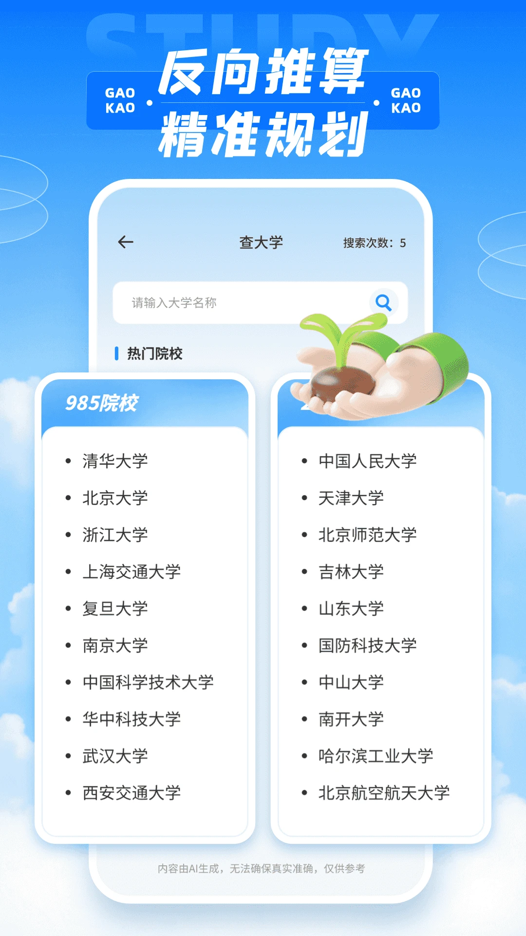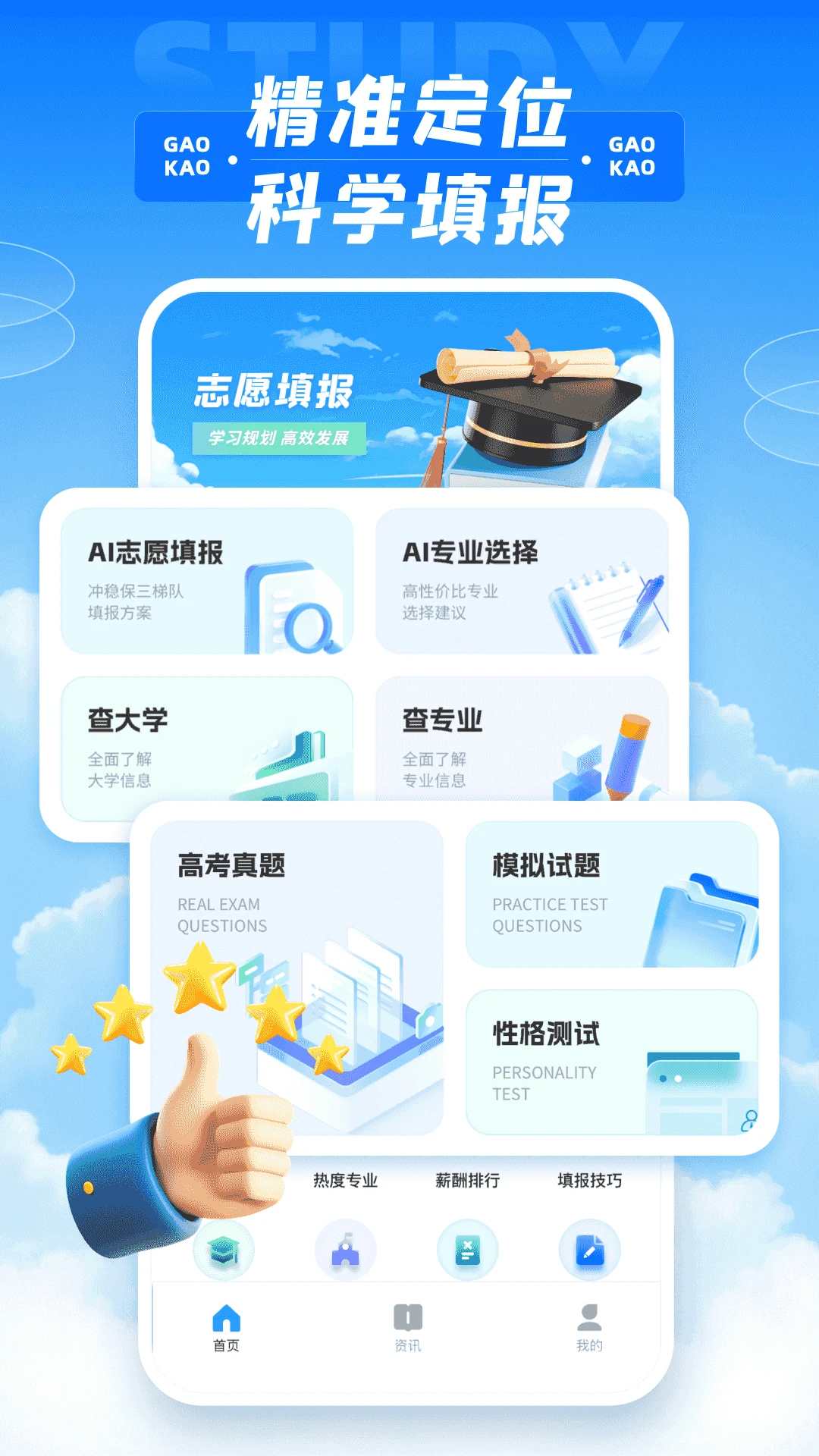 AI志愿推荐:输入高考分数后,系统自动生成“冲稳保”三档院校方案,支持按地域、专业类型筛选。