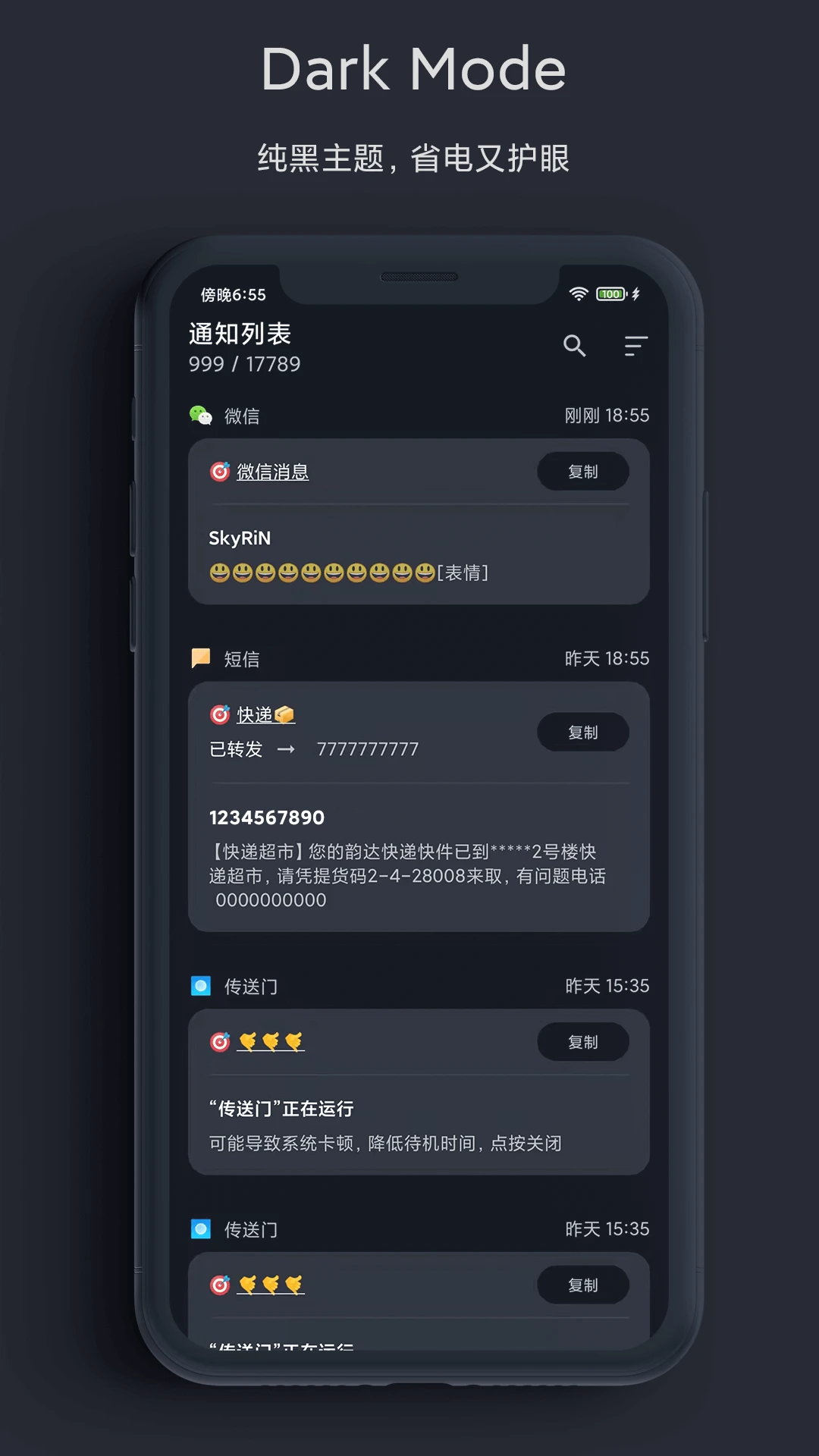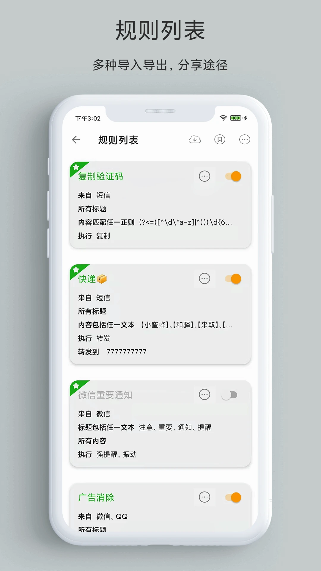 通知助手目前具备消除通知、打开通知、自定义播报、静音、提醒、振动、自动复制、短信回复、短信转发、邮件转发10种执行模式,您可以通过规则设置任意组合这些模式实现多种功能。