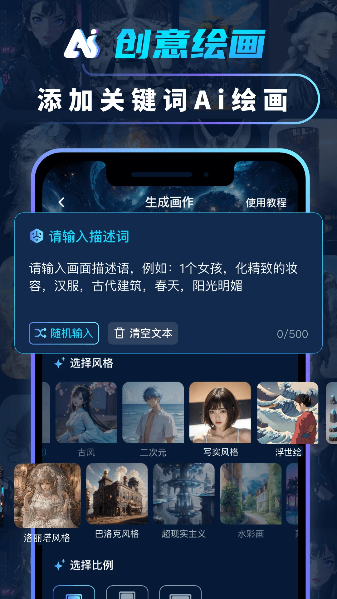简单输入你的想法或者任何你能想像到的,选择你想要的任意风格,点击"生成画作"等待作品生成,就能看到只属于你自己的专属作品,让你身临其境,妙笔生花。