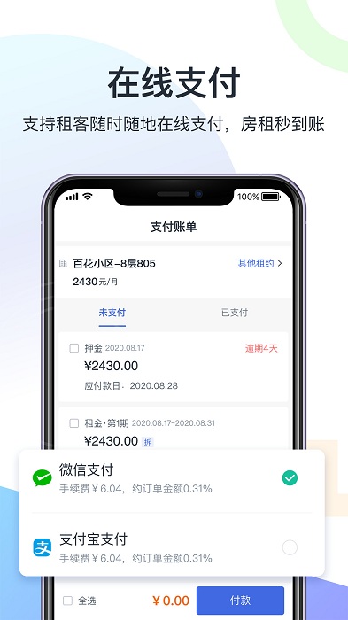 支持租客随时随地在线支付,房租秒到账。提供多种支付方式选择,包括微信、支付宝、银行卡等。支付记录自动同步,资金流向清晰可查。