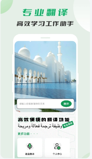 阿拉伯语翻译软件是一款专为学习、旅游、商务等场景设计的智能翻译工具,采用前沿AI技术打造,为用户提供高效便捷的语言服务。软件集成了文本翻译、语音互译、拍照翻译等多种实用功能,支持中文与阿拉伯语的双向互译,并扩展了多语言翻译能力。无论是日常交流、商务洽谈还是旅行沟通,都能轻松应对。其简洁直观的界面设计和强大的离线功能,让用户在任何环境下都能获得流畅的翻译体验,是跨语言沟通的得力助手。