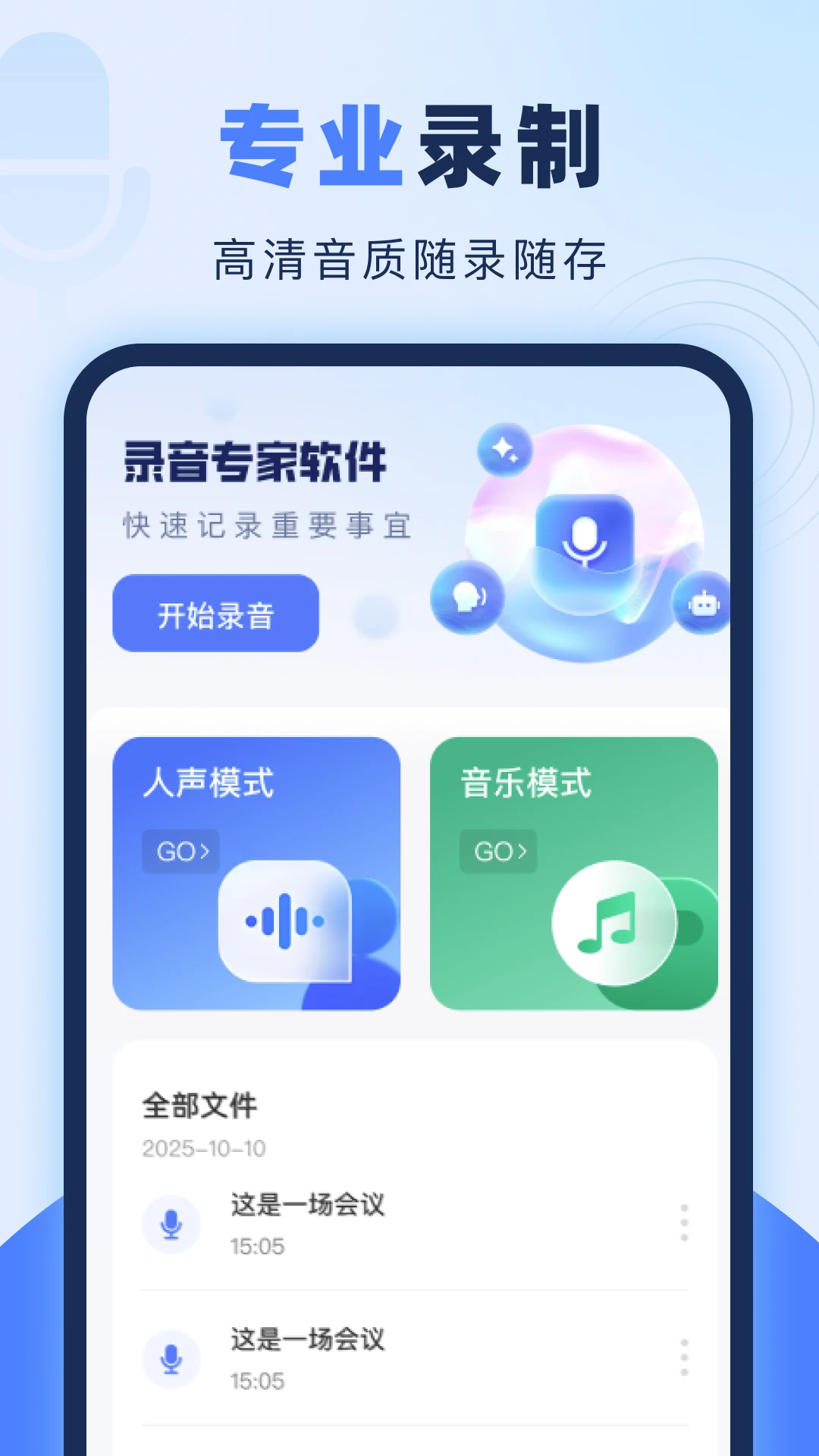 录音专家软件是一款功能强大的专业录音工具,致力于为用户提供高质量的录音体验和便捷的声音管理服务。无论是会议记录、课堂笔记还是音乐创作,它都能轻松胜任。软件支持多种录音模式切换,满足不同场景需求,同时提供智能文件管理、月历视图检索等实用功能,让录音文件整理变得简单高效。此外,录音专家还内置了文字处理、备忘笔记和轻音乐播放等附加工具,真正实现了一站式声音解决方案,是商务人士、学生和创意工作者的理想选择。