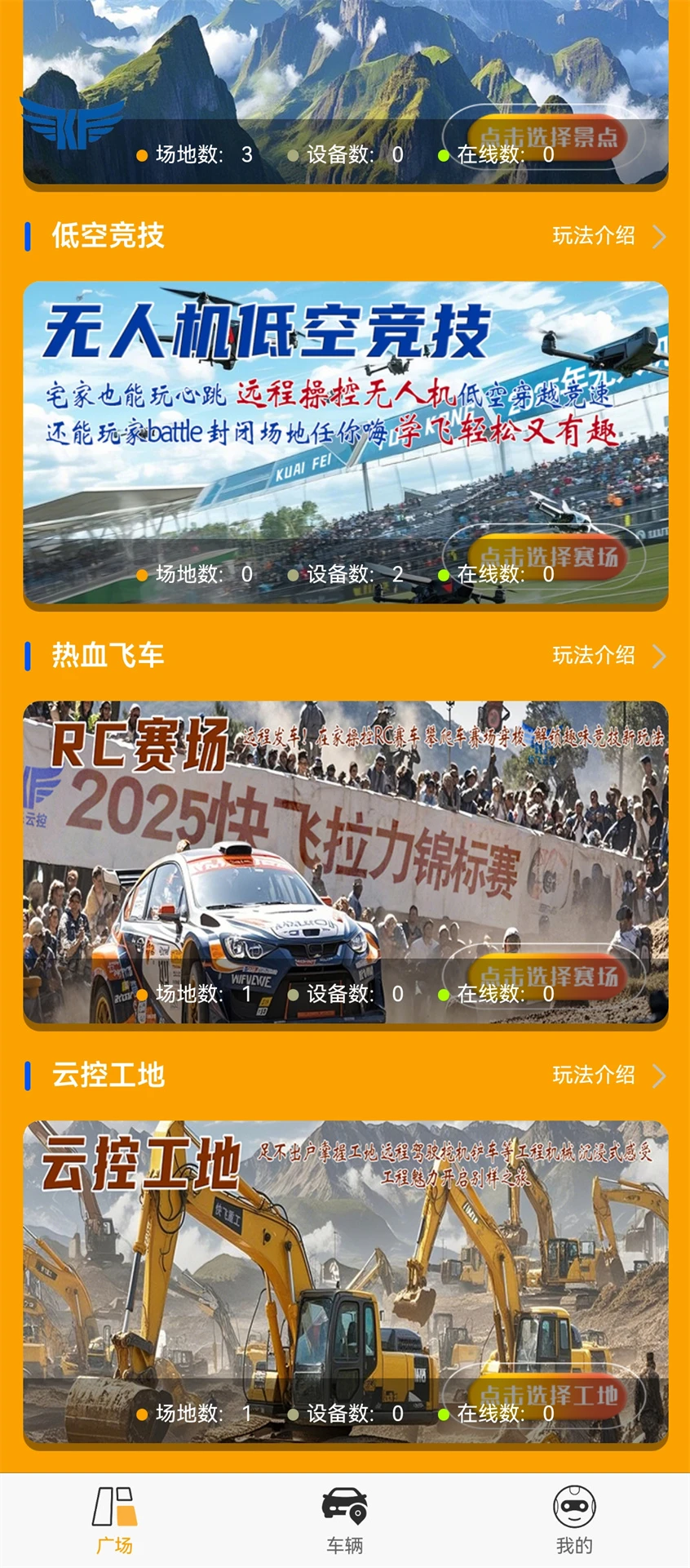 快飞云控是一款远程控制APP,在APP中可以和朋友一起远程遥控无人机、竞技赛车、游艇、皮卡车、挖掘机、装载机、翻斗车、越野车等,充分体验手机远程智控、竞技的乐趣。用户可以使用手机操控场地中的车辆、无人机等设备,视频画面实时传输,可语音对讲。