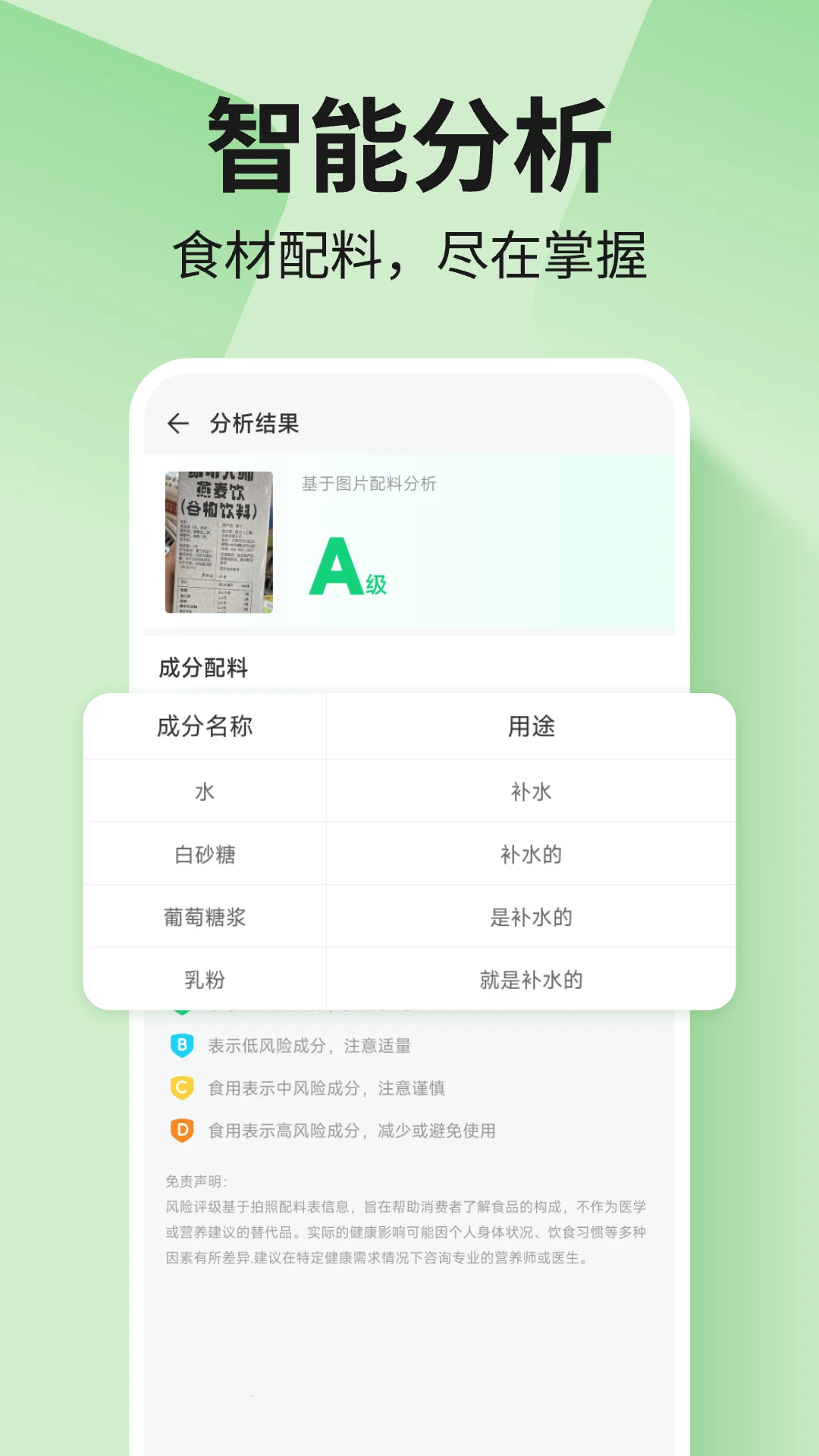 海量数据库:覆盖市面上绝大多数预包装食品的配料信息智能提醒:针对高糖、高盐、高脂等不健康成分自动发出警示