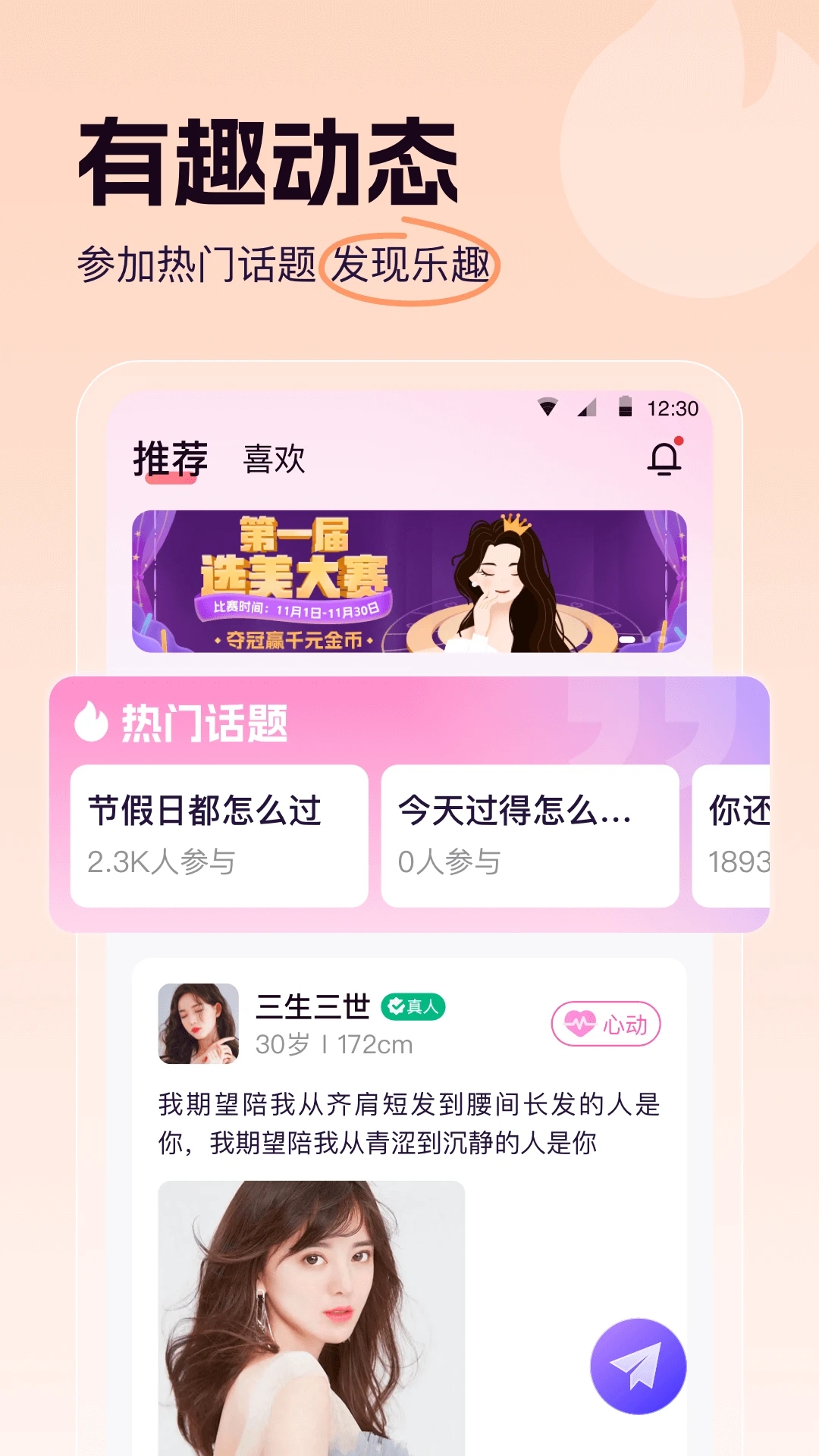 【高品质社区】相缘拥有活跃的用户社区,90%以上的用户每天都会通过动态更新来分享自己的生活点滴。在这里,您不仅能够找到心仪的伴侣,还能结识志趣相投的朋友。相缘致力于打造一个温暖、真实的社交环境,让每一次相遇都充满可能。
