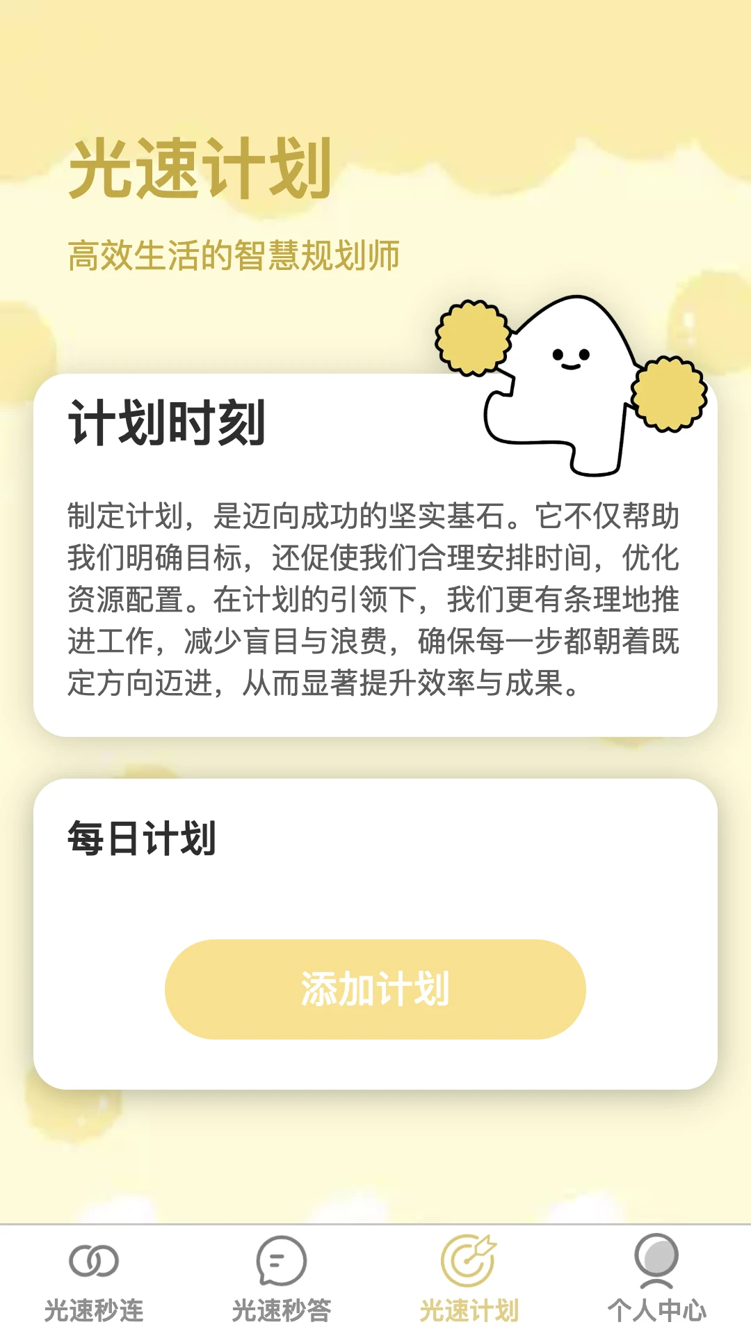【光速计划】光速计划,则是您实现目标、管理时间的得力助手。无论是个人学习计划、健身目标还是工作项目安排,光速计划都能帮助您轻松制定。通让您的每一步都朝着目标稳步前进,让生活与工作因此变得更加高效有序。