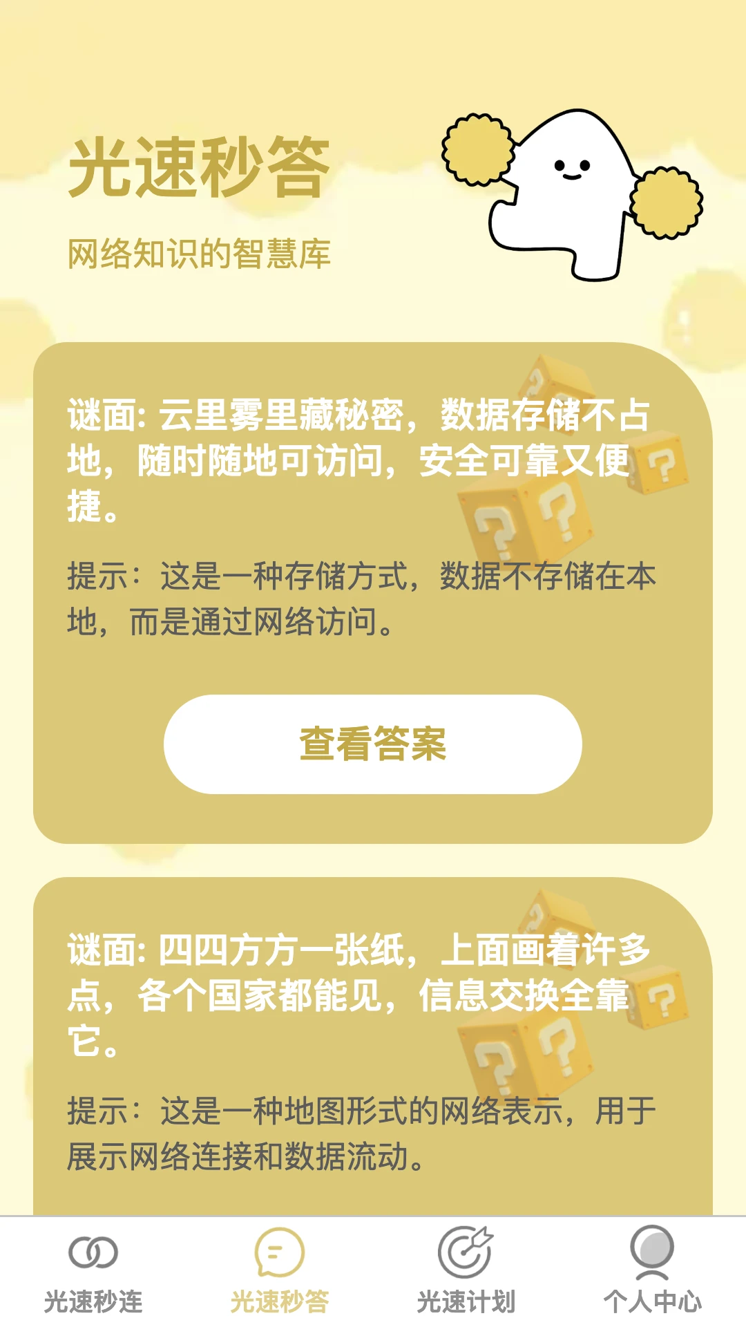 光速秒连,一款融合网络智慧、生活便捷与高效规划的全方位应用,旨在为您打造一个流畅无阻、智慧满满的生活与工作环境。无论您是网络达人还是计划大师,光速秒连都是您手中不可或缺的超级工具。【光速秒答】光速秒答,汇聚海量知识问答,无论是生活知识还是日常小技巧,都能在这里进行趣味问答并找到答案,让您的生活更加得心应手。