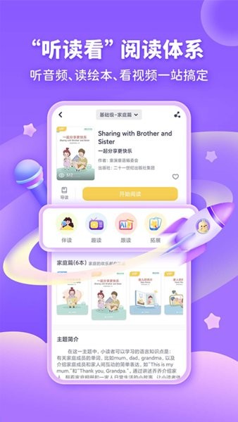 专业的阅读陪伴官通过生动有趣的视频讲解故事,激发孩子的阅读兴趣;同龄小朋友的示范发音视频配合AI智能评测系统,帮助孩子掌握标准的语言表达;海外儿童真实生活情景视频,让孩子足不出户就能感受多元文化;原创双语互动绘本和音频剧,为孩子提供沉浸式的语言学习环境;精选中文互动绘本和音频剧,满足不同年龄段的学习需求;创新的UU拍功能,让阅读成果可视化,激发孩子的学习动力。