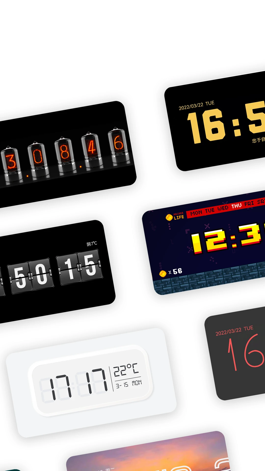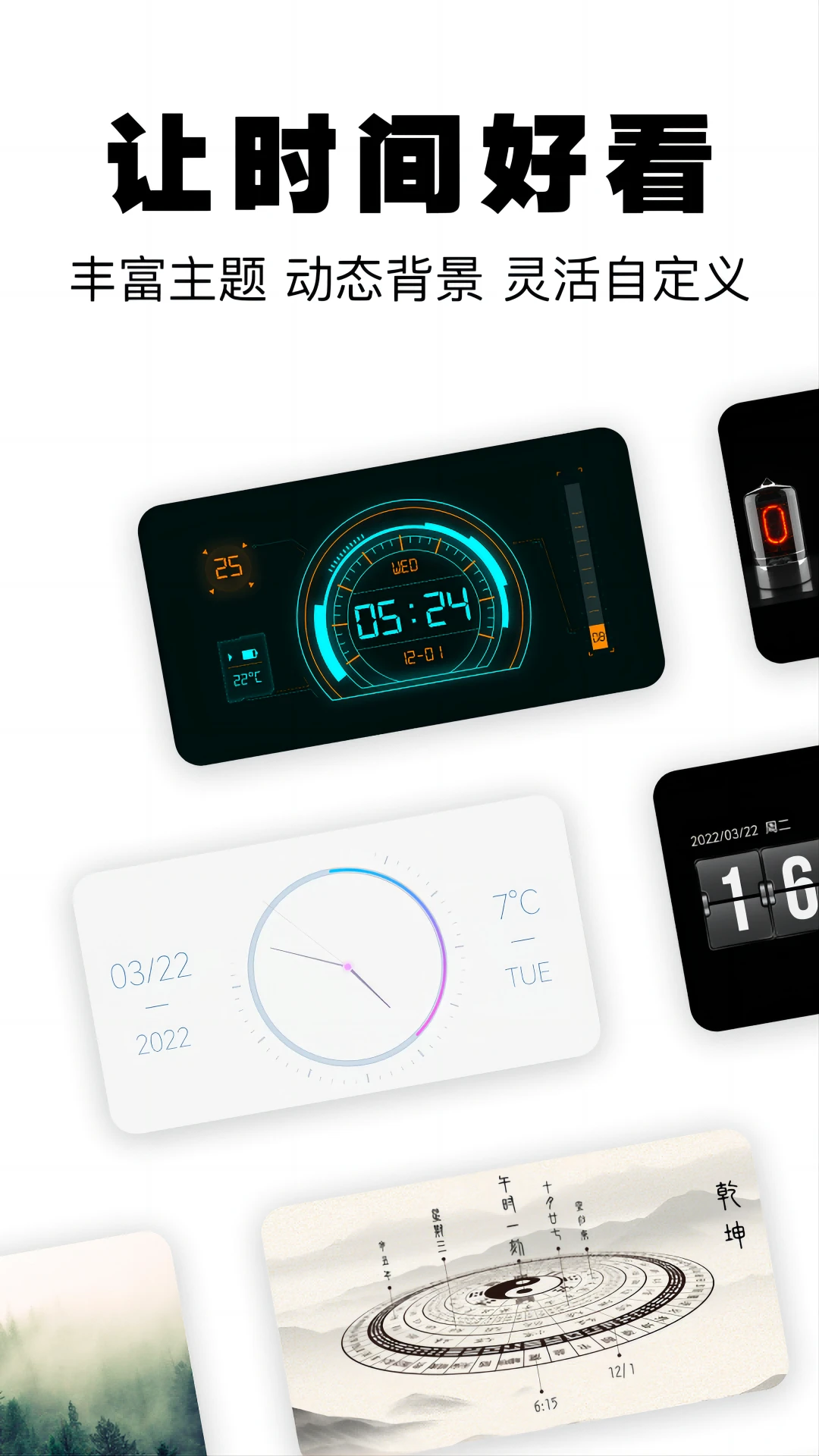 个性化主题功能,提供多种风格时钟皮肤,包括电子墨水、像素风、八卦时钟等,满足不同审美需求。