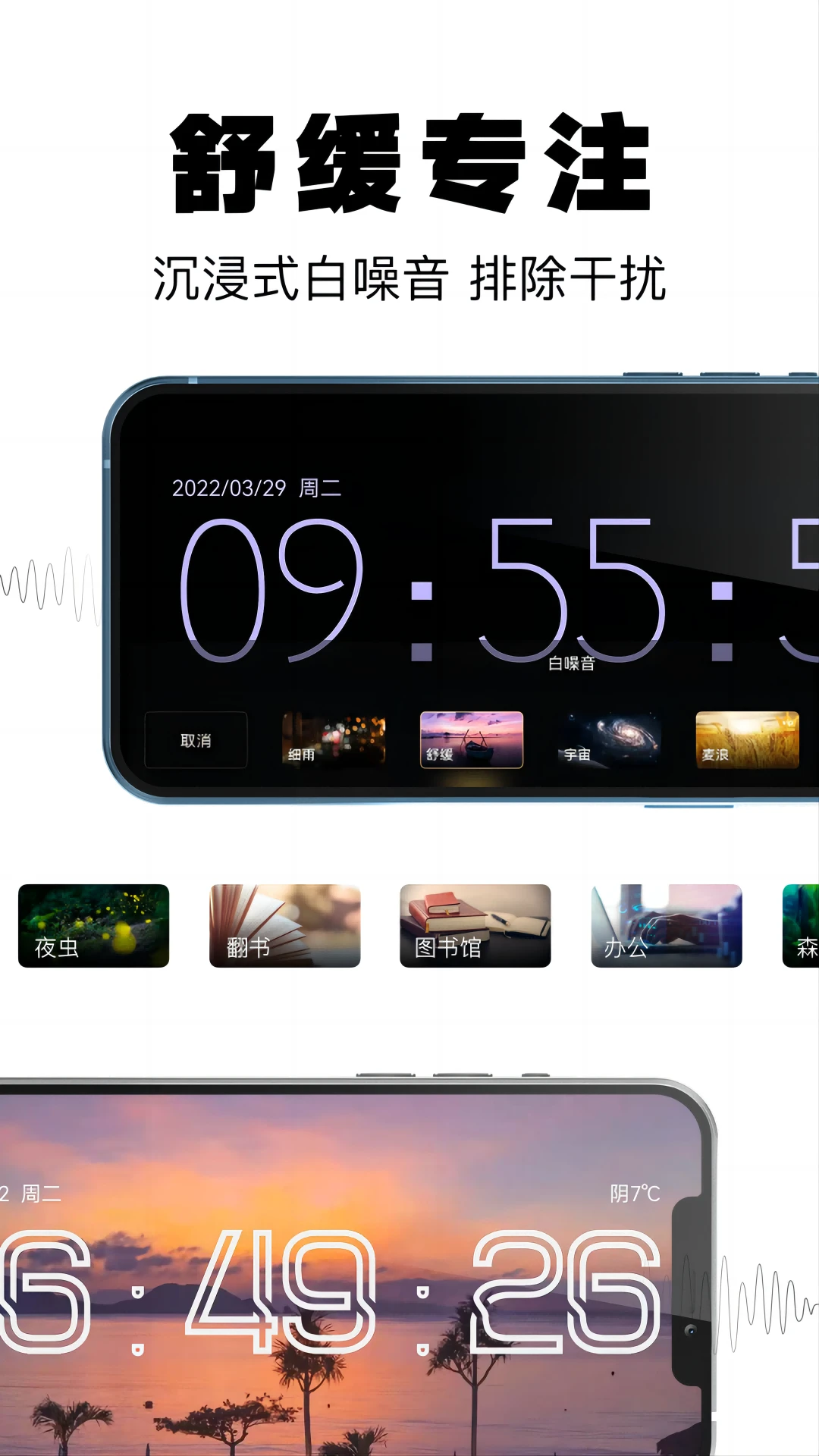 白噪音功能,提供多种环境音效,帮助用户屏蔽外界干扰,营造沉浸式专注氛围。