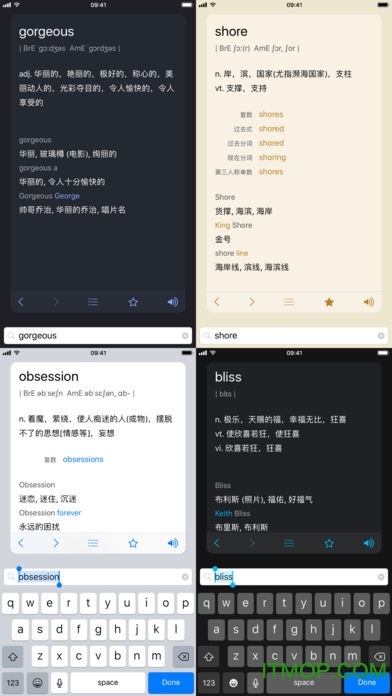 查词记录通过iCloud自动备份,并可在您的多台iOS设备上保持同步,确保学习进度永不丢失。无需打开应用,即可在Spotlight系统全局搜索中查询单词释义,大幅提升工作效率。四款精心设计的主题:纯白、纯黑、书黄和午夜蓝,满足不同用户的审美需求。使用AppleWatch应用和表盘部件快速复习单词,充分利用碎片化时间学习。通过3DTouch主屏快捷键和PeekPop快速浏览功能提升使用效率,让查词过程更加行云流水。使用专为iOS外接键盘打造的多种快捷键,为专业用户提供更高效的操作方式。在支持SplitView分屏显示的iPad上,将"极光词典"置于屏幕的一侧,在屏幕另一侧的应用中拷贝词句时,对应的释义会自动显示在"极光词典"中,实现真正的智能联动。