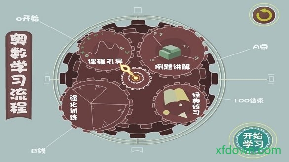 "奥数讲堂"每一讲包含"课程引导"、"例题讲解"、"经典练习"、"强化训练"四个学习流程,每一讲有对应的学习状态标志,初始状态为"未学"。这个模块采用循序渐进的教学方式,确保孩子能够扎实掌握每个知识点。