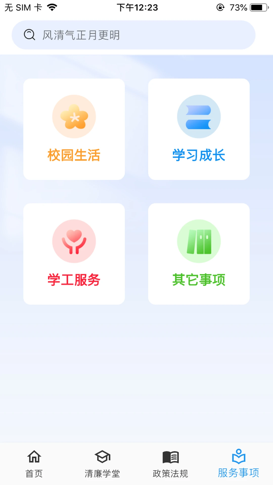 清廉校园是针对高校用于清廉教育宣传、学习和在线考试的新媒体平台,由清廉学堂、政策法规、服务事项、专项考试四部分组成。清廉学堂提供相关知识点学习;政策法规提供国家、高校的法律法规查看;服务事项展示高校提供的服务的办理时间、地点、材料、流程等相关信息;专项考试采用自主组卷、特定人员参加的考试模式,为相关人员考核提供帮助。