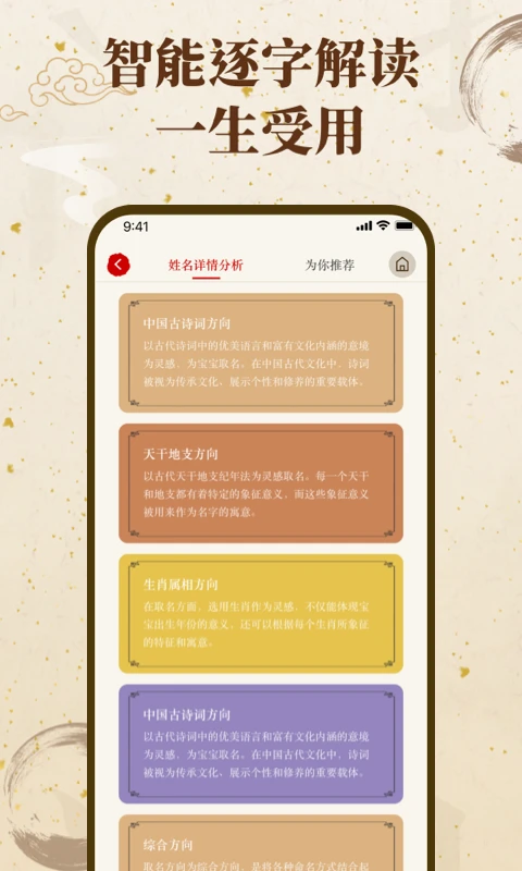 软件内置诗经起名模块,精选《诗经》经典词句,为宝宝取一个富有诗意的名字。
