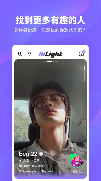 HiLight拥有多种身份牌,你可以在这里认识又酷又坦率的新朋友,Ta可能是话剧演员,乐队主唱,程序员,或者对这座城市里的小酒馆如数家珍的酒友。平台还会根据你的兴趣爱好推荐可能合拍的新朋友,让每次相遇都充满惊喜。