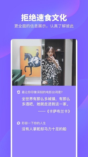 我们拒绝纯看颜值的滑动匹配,通过「私人专访」问答模块,你可以拥有全面展示自己、认真了解对方的机会。这个特色功能让用户能够展现更立体的个人形象,找到真正欣赏你内在的知己。