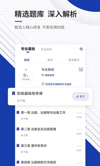 作为出版行业从业资格认证的专业备考工具,本软件严格依据最新考试大纲开发,内容涵盖初级、中级出版专业资格考试全部考点。由资深出版专家团队精心编撰,确保每道题目都符合考试要求,帮助考生在有限时间内实现最高效的备考效果。