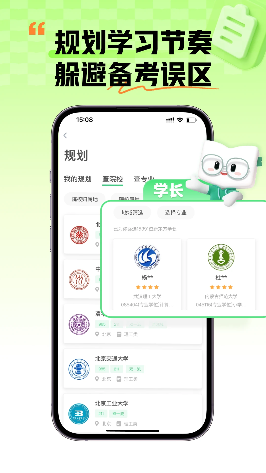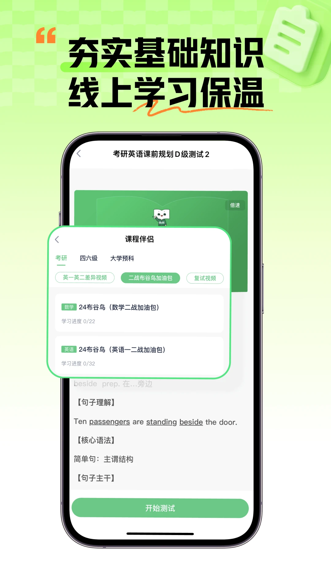 新东方考研、专升本、四六级学习平台【规划备考】提供考研择校、备考资料、历年真题、知识点刷题、专业课学长预约等一系列备考资源【线下教学】围绕线下授课场景APP提供课程信息、到课签到、回放补课等功能【线上保温】提供课前规划、预备、起航、夯实、续航、巩固等课程助力课堂知识内化吸收【测试评估】摸底测、入学测、随堂测、阶段测等多种测试场景及线上答疑,搭建起从课堂知识输入到运用输出的桥梁