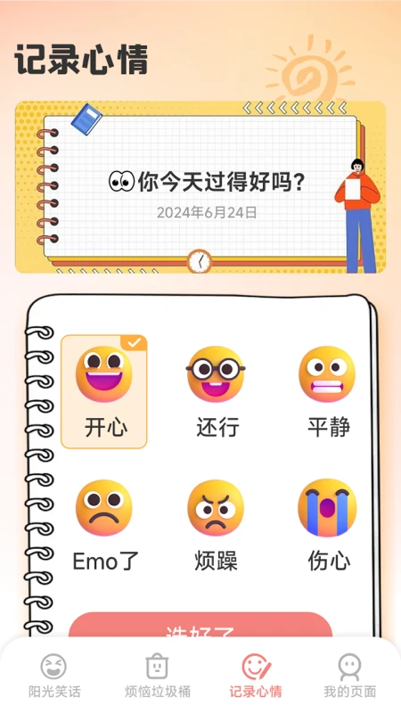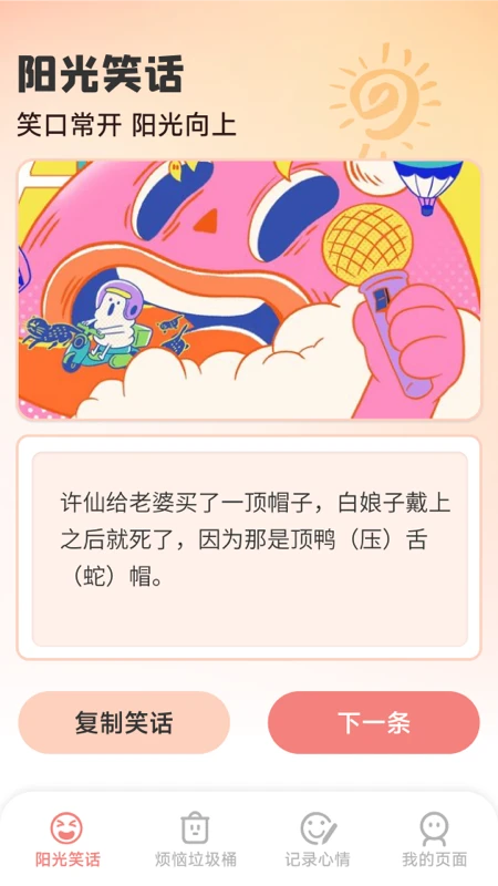 【阳光灿烂】一款集阳光笑话、烦恼垃圾桶、记录心情于一体的应用,点亮您的心灵世界。笑话:精选海量优质笑话,风格多样,内容新颖,让您笑口常开。烦恼垃圾桶:如同您专属的情绪回收站,将烦恼倾诉于此,把负面情绪统统倒掉。记录心情:是您心灵的避风港,无论是开心、难过、激动还是惆怅,都能详细记录。
