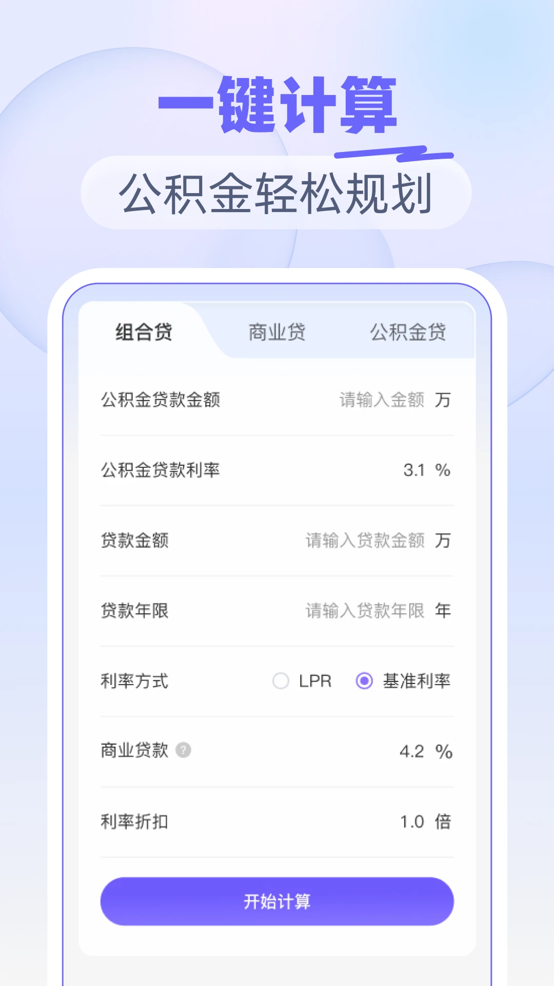 公积金贷款计算器:支持自定义输入贷款金额、期限、利率等核心参数,一键生成月供与总利息明细。