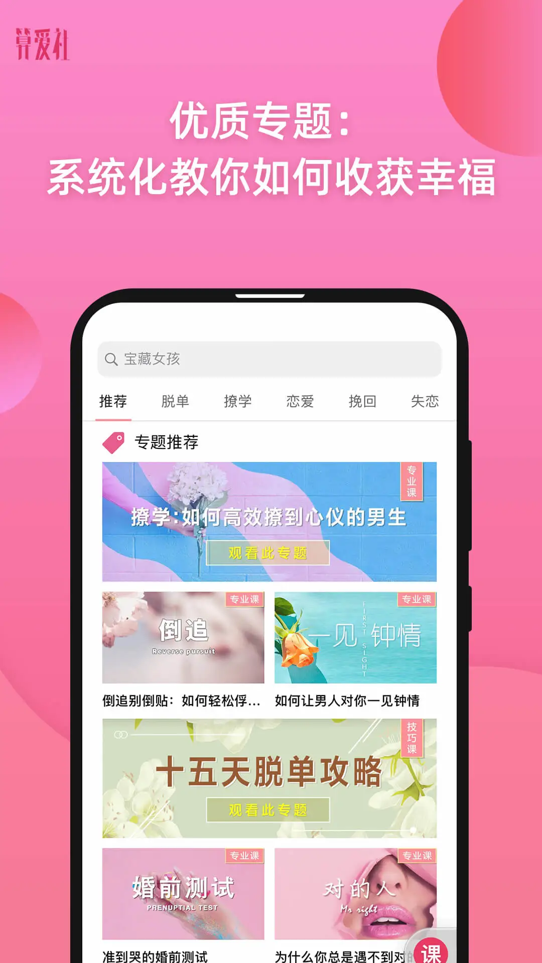 通过视频、直播、图文等多媒体形式,向用户传递脱单、恋爱、婚姻、出轨、分手等知识领域的情感技能,提升亲密关系心理学、认知科学知识储备,重塑正确理性的人际关系认知,完善自主解决情感问题能力,进而为自身建立系统而健康的恋爱观、婚姻观。