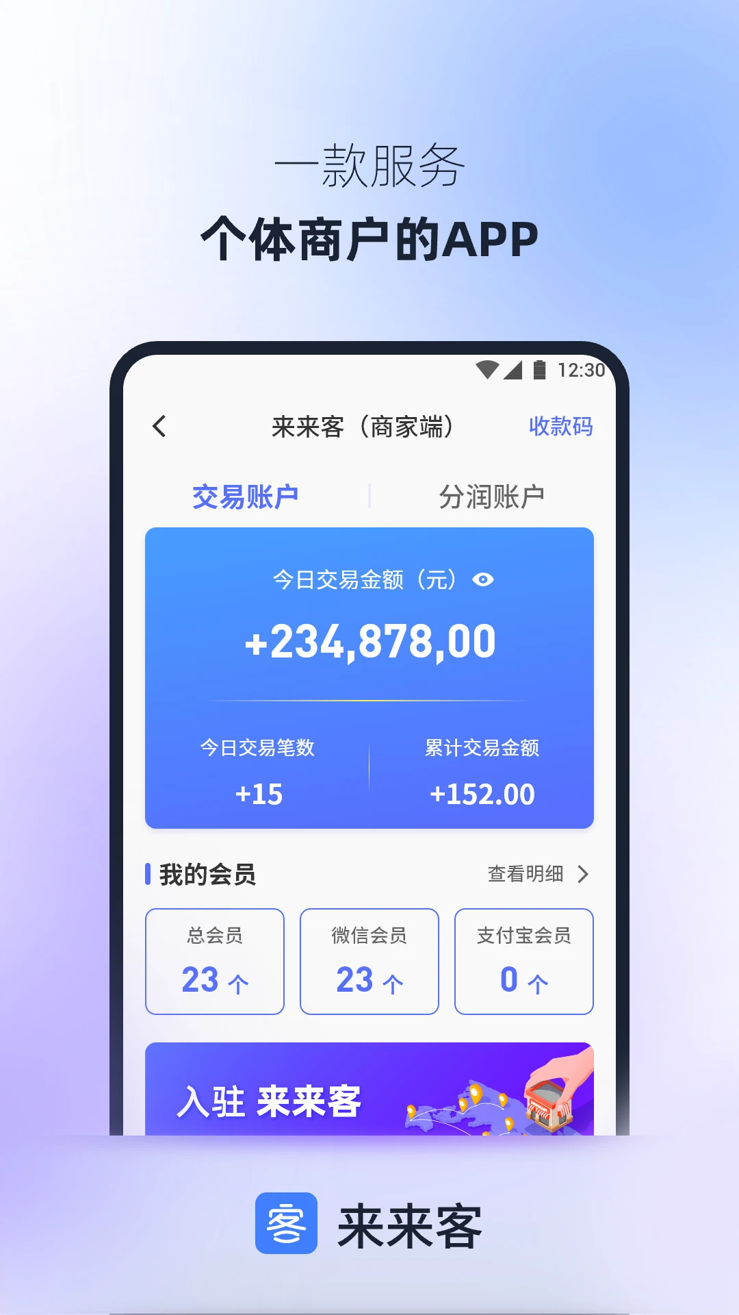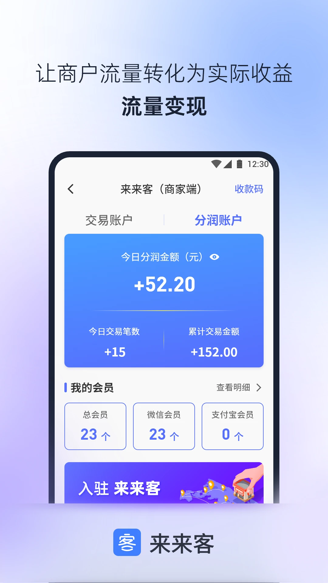 来来客是一款专门服务个体商户的APP,来来客在不改变商户的经营方式和不改变消费者的消费习惯下,流量变现,实现商圈内商户流量共享、共赢