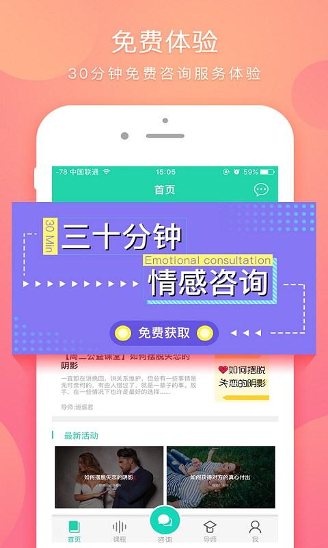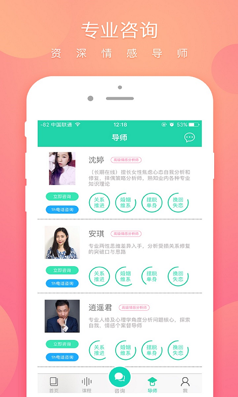 提供实时一对一咨询模式,专业导师团队全程为你服务,随时随地解答你的情感疑惑,解决你的情感难题。