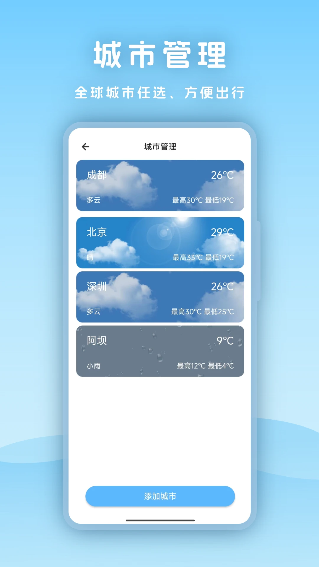 多城市支持:支持同时添加多个城市,方便用户随时切换查看。
