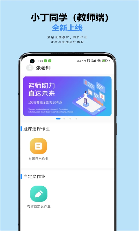 小丁同学教师端app,是专门为全国小学老师打造的同步教学软件。帮助老师有效管理学生课本点读情况,在线作业完成情况的监督,同时可以进行错题批注及时掌握学生学习程度。同步英语语文点读教材:人教版(新起点)一二三四五六年级上下册,人教版(PEP)三四五六年级上下册、苏教版(译林)、沪教版(上海)、牛津上海版、新牛津英语、教科版(广州版)、闽教版、湘少版、冀教版、外研版(一年级起点)和外研版(一年级起点)、北大版。同步小学数学语文英语科学课堂作业:1、同步每日学校课本作业,每日在线做题,让学习更生动有趣2、系统自动批改,错题重做,反复练习错题,巩固未掌握的内容3、期末个性化试卷(针对一个学期下来未掌握课题出卷)有效提高学习时间通过对学生作业情况、学习情况的监督,了解学生的学习习惯和知识掌握情况。辅助教师了解学生当前知识掌握情况和学习情况。过程显性可控,管理、反馈科学高效,并及时与家长保持联动,实现家校合力培养。学习不孤单,爱老师全程陪伴,反馈、辅导和激励。适时给以成就感,提高学习兴趣,增强学习动力。支持在线试卷的布置与批改,生成统计数据,从局部到整体,替代教师机械性重复工作,为教学减负增效。