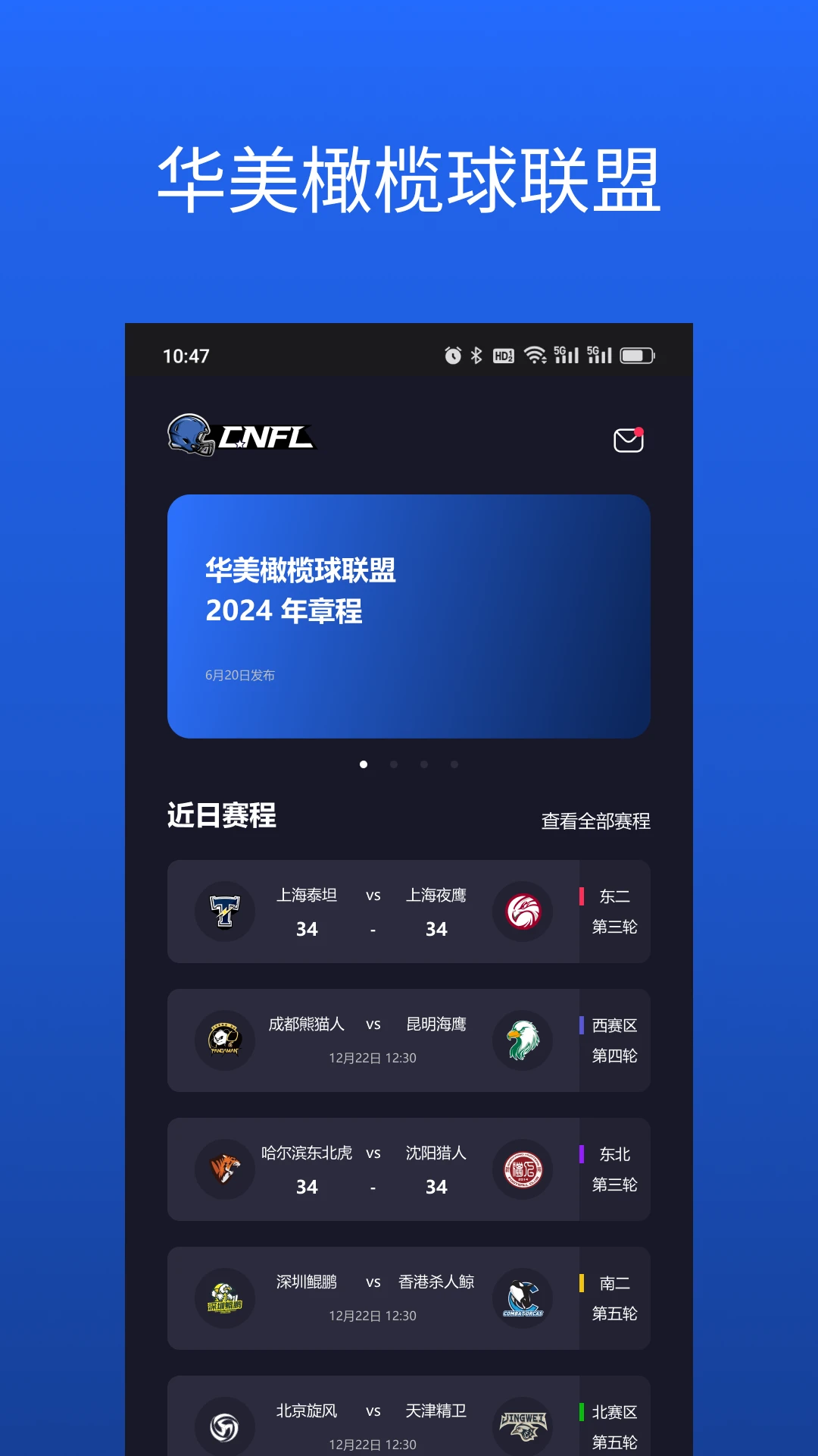 华美橄榄球联盟(CNFL)官方应用球员、教练注册,比赛报名,查看赛程和比赛结果,查看球员和球队信息。可在App内对赛区和球队进行筛选,快速查看排名。