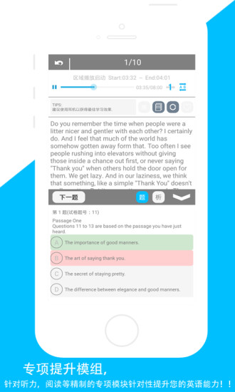 佳用英语四级专版是一款专业的移动端英语学习应用,专为备战大学英语四级考试的用户设计。软件采用先进的教育理念,将四级考试大纲要求与智能学习系统完美结合,提供从基础词汇到真题演练的全方位备考方案。通过每日定制的学习任务和即时反馈机制,帮助用户建立系统的知识体系,稳步提升英语水平。应用界面简洁友好,学习进度可视化,让用户随时掌握自己的备考情况,真正做到科学备考、高效提分。