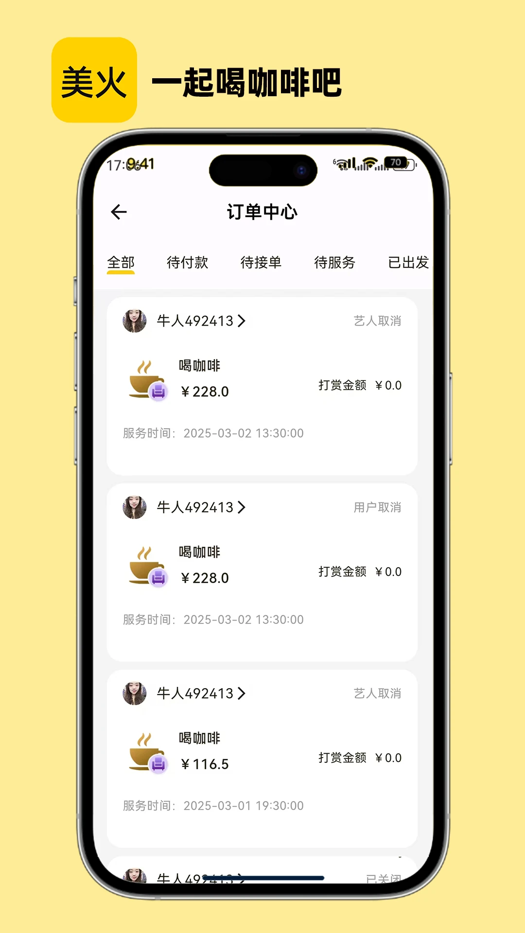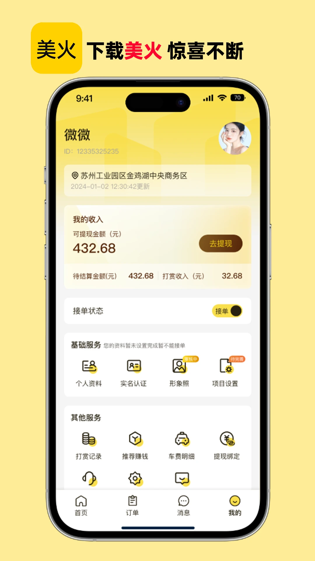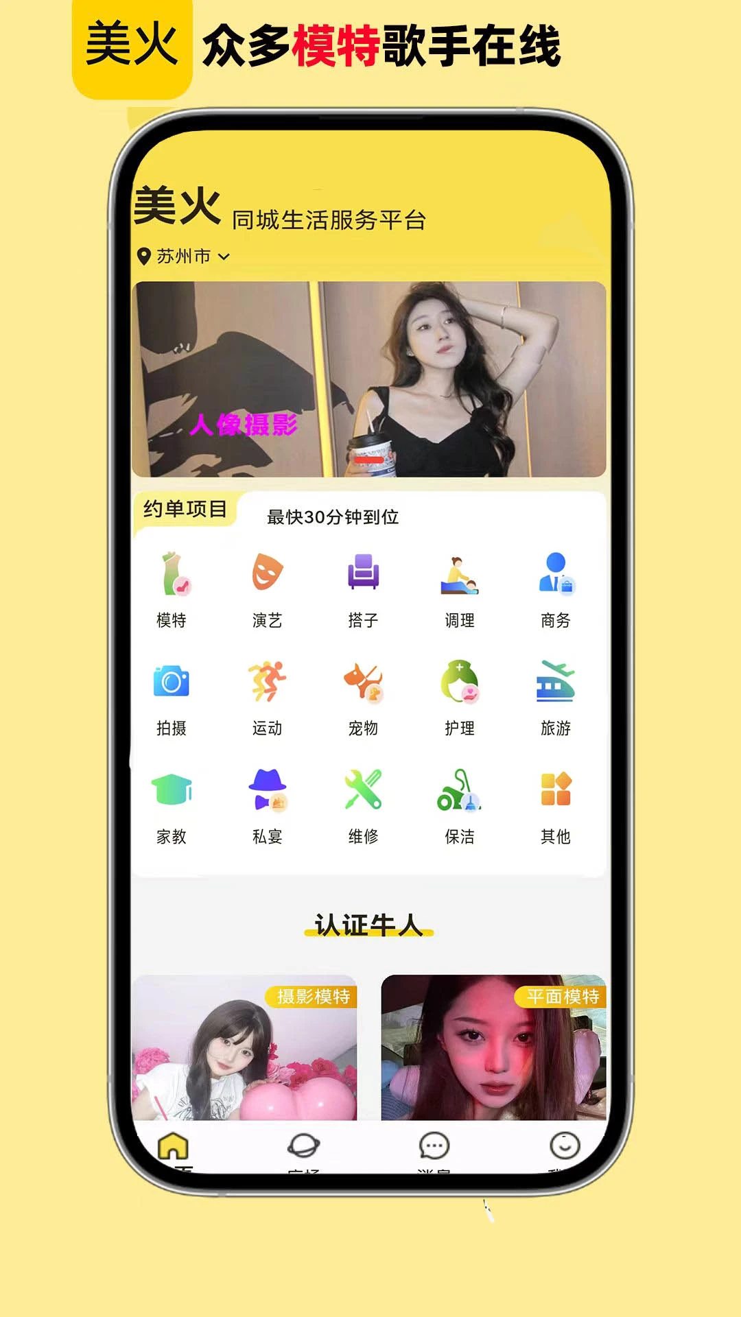 美火是一款专业的接单服务软件。牛人与大佬快速查看,直接开聊,直接下单。大佬多,牛人多,接单快!行业覆盖模特、演艺、美业、拍摄、商旅、休闲、运动、宠物、护理、办公、家教、私宴、维修、保洁等领域。