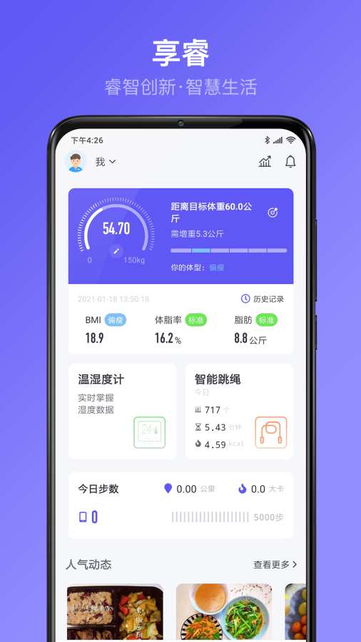 基于智能蓝牙设备的享睿分享平台APP,帮你称重、记录、管理体重,适配市面上90%的智能体脂秤。通过APP连接蓝牙智能体重秤,即可实时管理体重、体脂、体水、肌肉含量等参数,全方位呵护您的健康,数据支持AppleHealth同步。添加家庭成员,更方便了解爱人和孩子的身体变化,支持生成家庭健康周报。动感社区优质人才分享流汗后的性感。海量健康秘籍,学会科学规划,活出好身材,社区活跃用户突破200万。