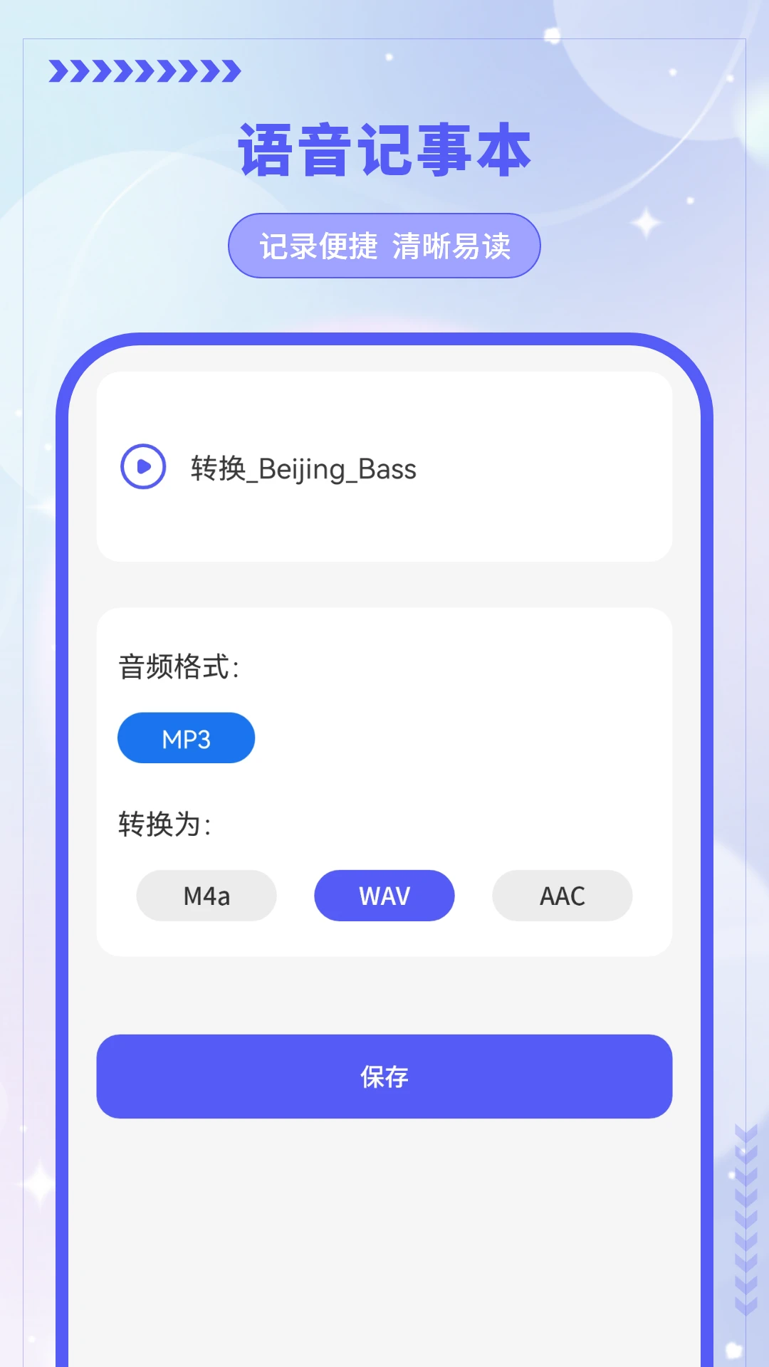 格式转换,支持WAV、M4A、MP3、WMA四种格式互转。