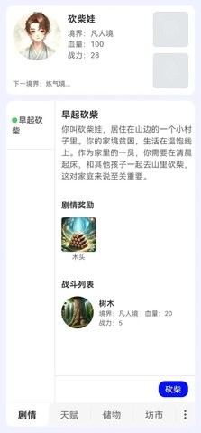 作为一款放置类单机修仙游戏,砍柴娃修仙的核心战斗系统采用纯文字描述,这种设计让人联想到早期的MUD游戏。游戏不以单纯的战斗力数值作为唯一评判标准,而是更注重整体修仙体验。主角的成长过程循序渐进,以主线剧情为主导,配合数值化的战斗系统,构成了游戏初期的基础体验。目前游戏内容相比其他同类作品略显单薄,可能还处于早期开发阶段,期待后续版本的丰富与完善。