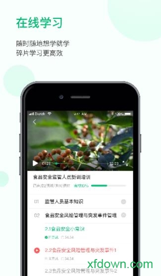 在线学习--课程内容由行业专家精心设计,采用动画演示、真实案例解析、名师视频讲解等多种形式呈现。用户注册后即可根据自身需求选择相应岗位的食品安全课程,学习进度可随时保存,支持离线下载功能。