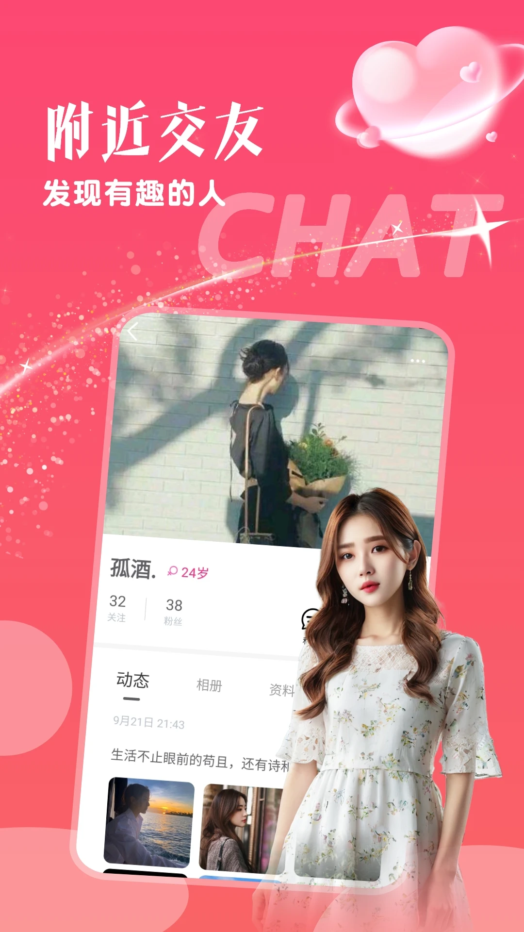 快来爱是集聊天交动态发送为一体,附近陌生人单身交友聊天约会,同城有缘人快速匹配单身陌生人交友平台。孤单的灵魂不在无趣,快速找对象处cp恋爱,相信缘分百分百就在身边,同城交友、附近约会、单身聊天、灵魂交友、陌生人交流。探寻身边陌生人,聊天交友,聊爱聊的话题,约喜欢的对象,早日脱单,幸福人生。喜欢就点击聊天,合适就恋爱约会。在这里,你可以分享生活点滴、互相倾诉心事,也可以发现对方身上的闪光点,相中只属于你的TA,让我们快来爱吧~软件特色【同城聊天】:平台根据个人地理位置推荐同城附近的单身异性,旨在快速找到合适的心仪对象,让交友高效,让聊天简单。【精彩动态】随意发表自己的心情,也可以随时随地感受大家的声音枯燥的生活需要不一样的新鲜感,改变沉闷的社交现状,跟海量线上朋友开心畅聊更多有意思的功能等你来体验,本地陌约旨在让广大单身男女轻松脱单,找到自己心仪的对象,展示自己,发现美好。来一场别具一格的同城约会。