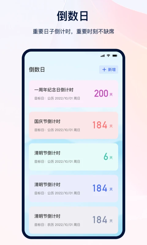 倒数日提醒:内置强大的倒数日功能,可设置重要日期提醒,再也不会忘记生日、纪念日等特殊日子。