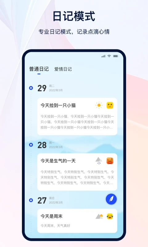 日记分类管理:创新性地将日记分为普通日记和恋爱日记,让用户可以根据心情和内容选择合适的记录方式。