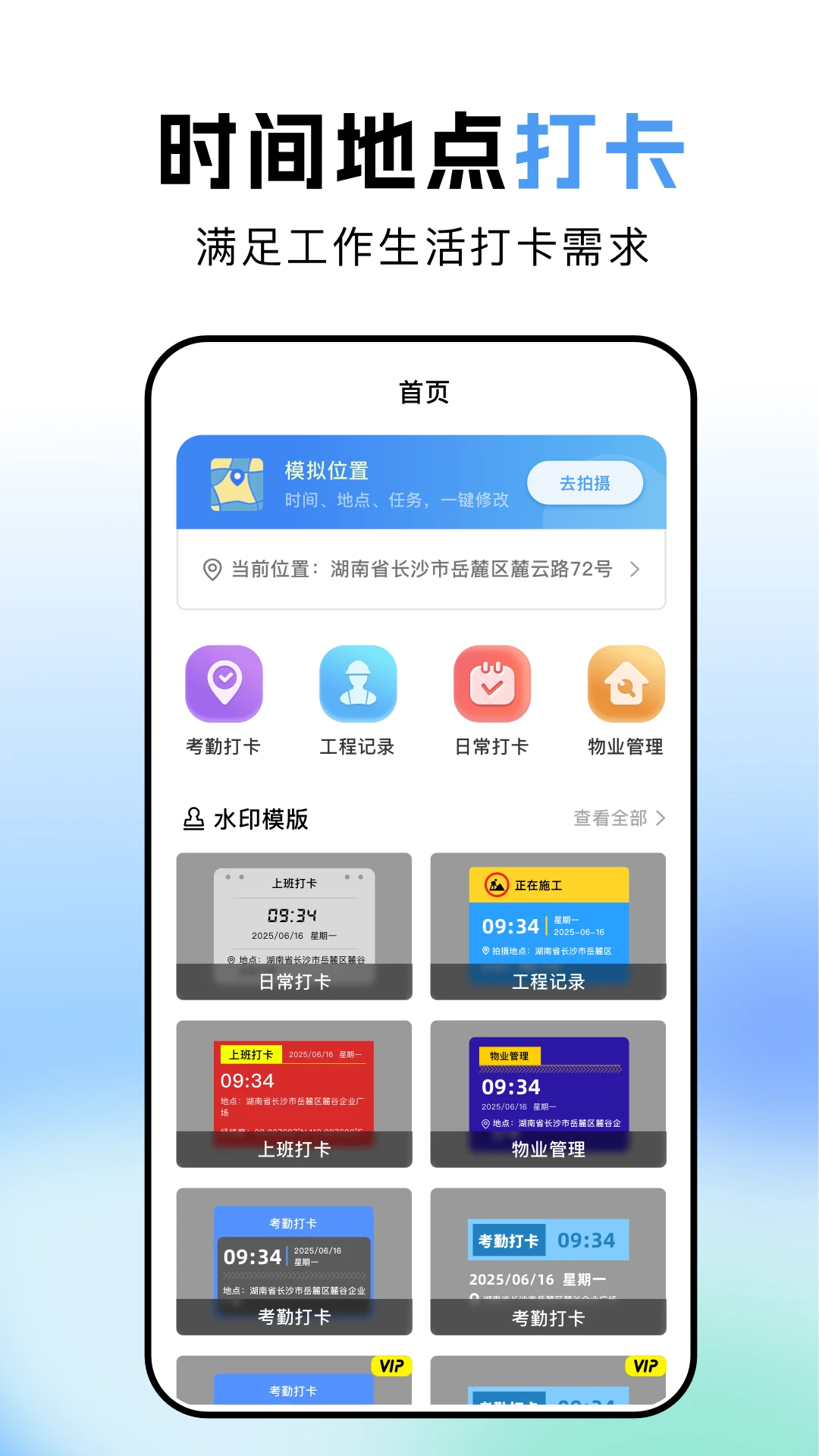 Fakerl模拟定位是一款可以添加真实时间地点水印信息,地点时间智能实时校准,拍照时自带位置、时间、天气等水印信息,真实还原工作或生活场景,满足在日常生活及工作中对图片、视频进行时间、地点等信息标记的需求。丰富的水印模版,满足各类工作生活场景打卡拍照需求。【适用场景】考勤打卡、工程记录、物业管理、日常打卡等,满足您在不同场景的拍照打卡记录需求,还原真实生活场景。【支持自定义】自定义水印修改多种水印类型,地址、时间、天气等支持自定义修改编辑,自定义自己的水印需求,高效实用。【专业的水印模板】超多种水印模板,支持各种生活和工作打卡需求,现场拍照打卡,日常考勤打卡,记录工作轨迹,记录时间和地点。
