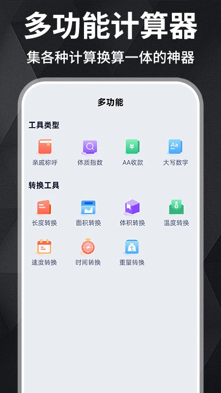 集计算器、汇率换算、亲戚计算器、房贷计算器、单位换算、年龄计算、BMI计算等为一体,功能强大,方便好用,简单解决各种计算、换算的超级计算器。【计算器】基础计算器支持按键震动,比自带计算器更好用【汇率换算】实时汇率、支持160多个国家/地区、长按拖动排序、点击切换基准货币、侧滑删除货币【亲戚计算器】三姑六婆,亲戚称呼,一键搞定【房贷计算器】支持商业、公积金、组合贷,支持查看明细【大小写转换】人民币大写数字,报销更方便【时间计算器】轻松计算两个日期之间的分钟数、小时数、天数、周数、月数、年数【时间计算】帮助你做出小时和分钟加法和减法计算【单位换算】支持面积、体积、速度、重量力转换。