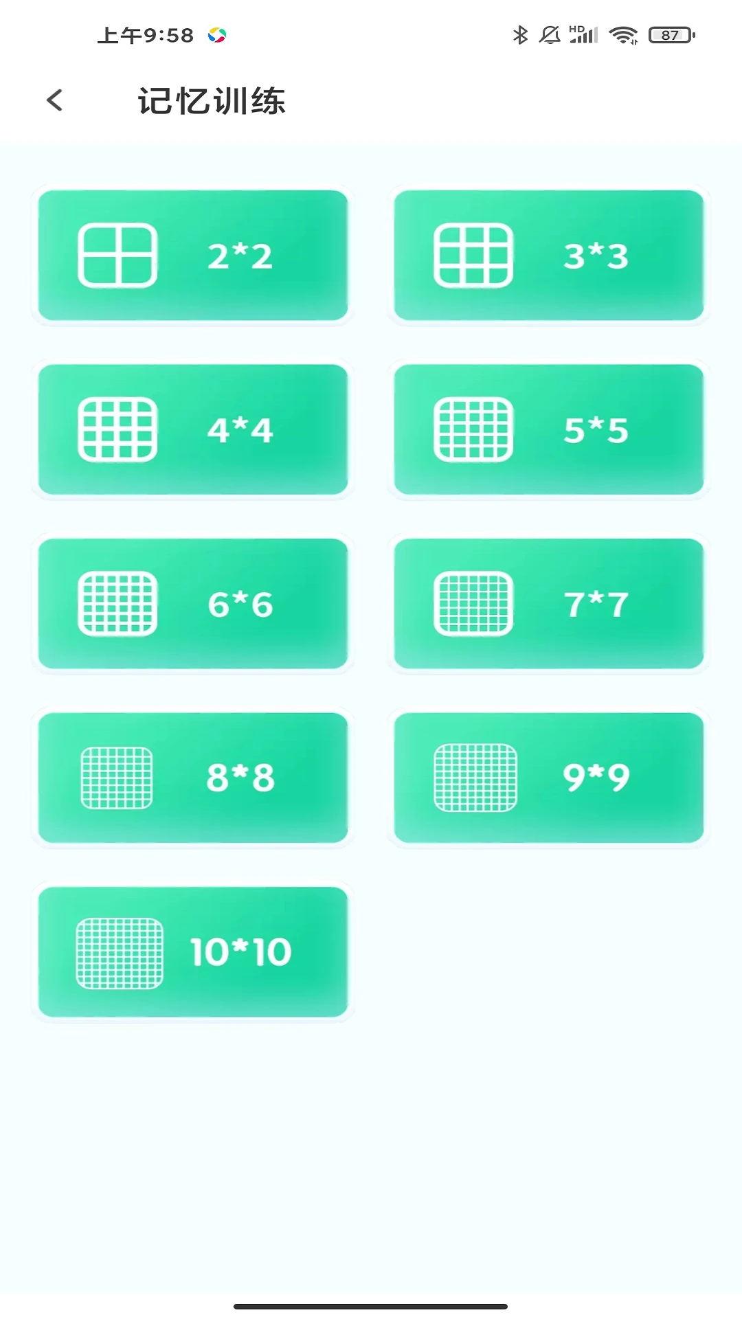 记忆训练模块包含3x3到10x10不同规模的格子记忆挑战