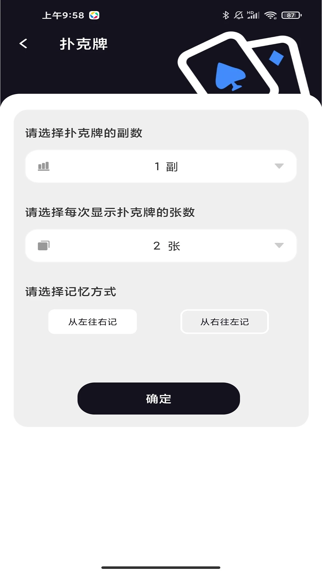 扑克牌训练系统提供多种难度选择,从单副牌到多副牌混合记忆