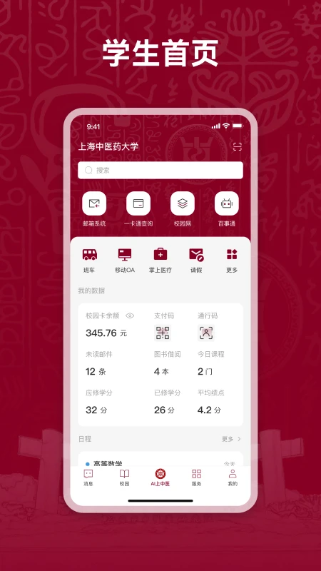 "AI上中医"是上海中医药大学推出的官方移动服务平台,是面向上海中医药大学师生提供的一站式资讯和应用服务的官方应用。