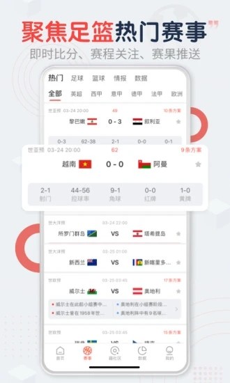 覆盖五大联赛、世界杯、亚洲杯、日职联、NBA等海量足球篮球热门赛事,大小赛程数据一键查阅,提供即时比分实况、深入剖析情报、历史数据实时追踪,更有聊天室等你参与互动,看球不容错过。我们还提供个性化赛事推荐,根据您的喜好智能推送相关赛事内容。